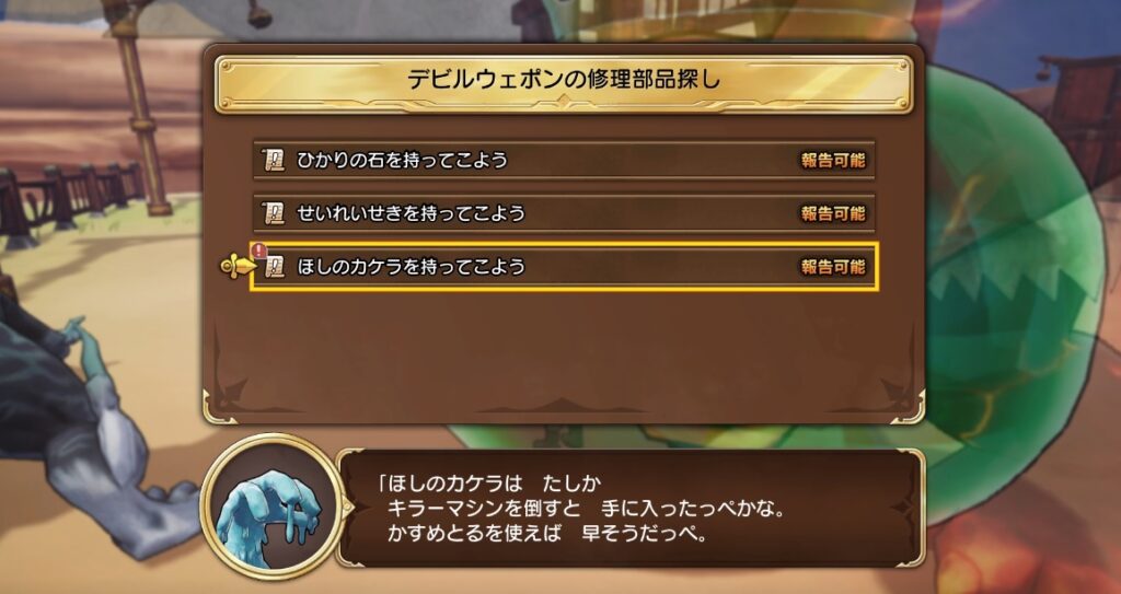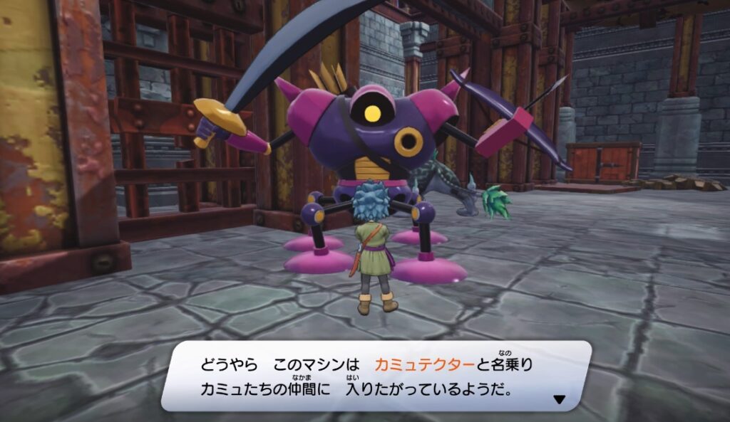 カミュで話かけるとクエストが進行し拠点に加入希望としてデビルウェポンが出現する。加入時の素材はオイルジュース1個。オイルジュースのレシピは竜の鉄道クエスト「復旧!オアシスの駅」をクリアすると拠点の商店で購入が出来ます。