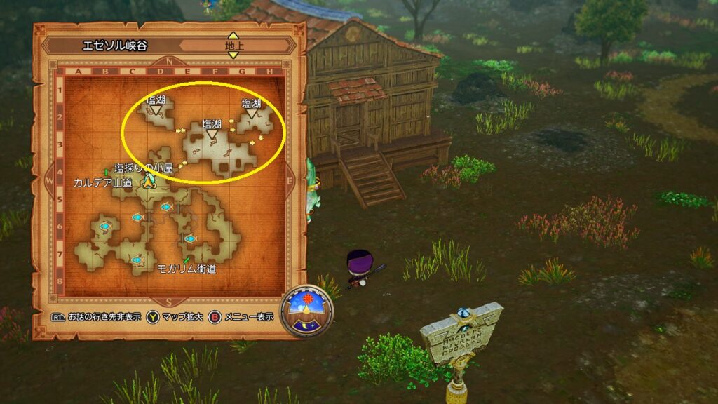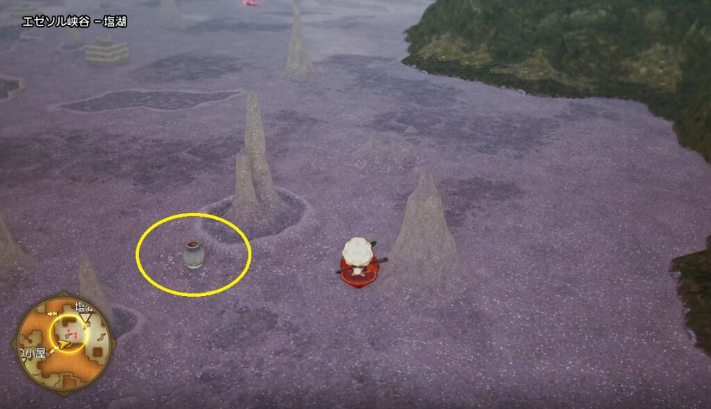 塩湖はエゼソル峡谷の北の方に広がっています。『岳都ガタラ→ガタラ原野→モガリム街道→エゼソル峡谷』の順で辿りつけます。 - エゼソル峡谷-塩採りの小屋に入りチレチェチェと会話する