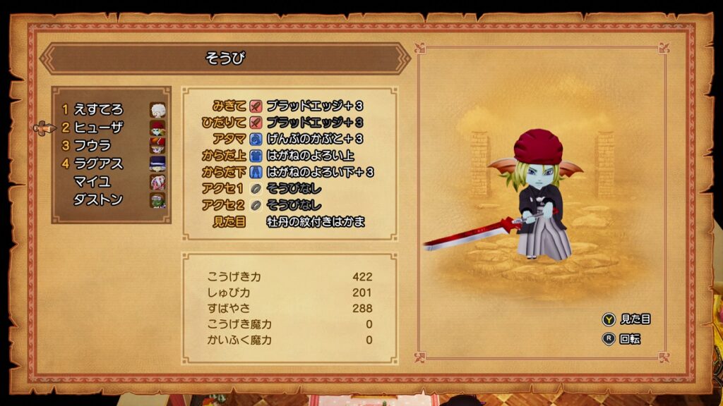 牡丹の紋付きはかまはヒューザの見た目装備です。そうびの画面からいつでも変更が可能になります。