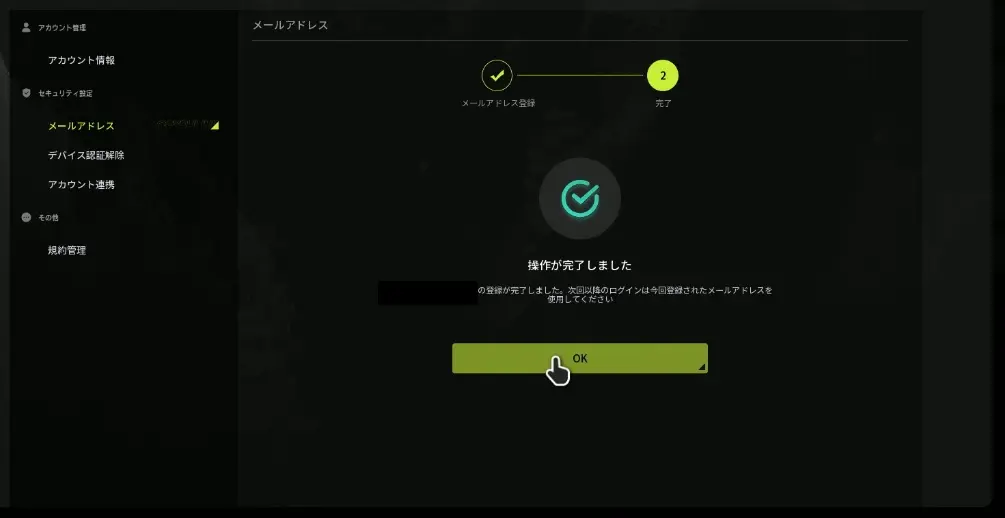 最後に「操作が完了しました」が表示されればメールアドレスの登録は終了です。スマホでログインしたい場合は、ここで登録したメールアドレスとパスワードを使えばPS5と同じアカウントでプレイすることが出来ます。