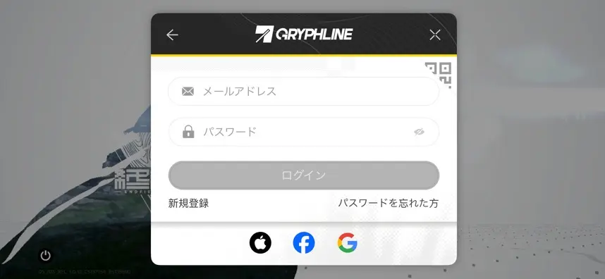 スマホで始めにエンドフィールドを起動すると↑のような画面になると思います(管理人はiPhoneユーザーです)。ログインの方法はいろいろあるんですがGRYPHLINEのアカウントを新規登録してログインするのが楽かなと感じました。