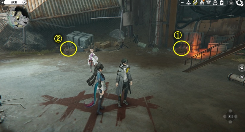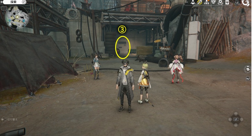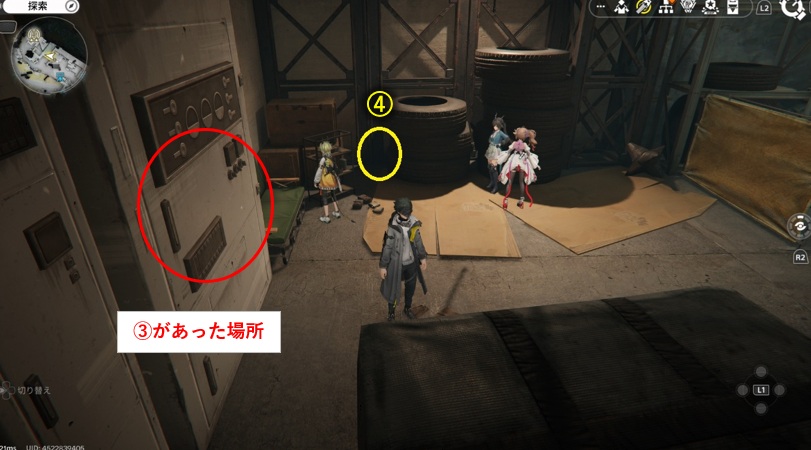 ③があった場所の横にあるタイヤの近く。少し奥の方にあるので近寄って確認してみてください。