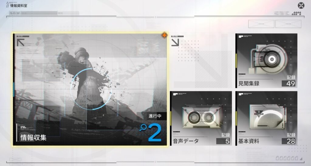 資料室にある情報収集は全て集めると報酬が貰える収集要素となっています。