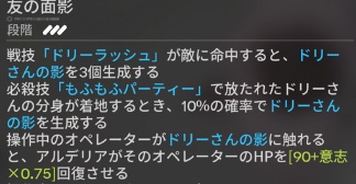 『操作中のオペレーターがドリーさんの影に触れると、アルデリアがそのオペレーターのHPを[90+意志×0.75]回復させる』