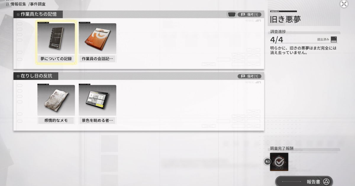 4つ揃えたあとに「メニュー→資料室→情報収集→旧き悪夢」から提出を行えばクリアです。