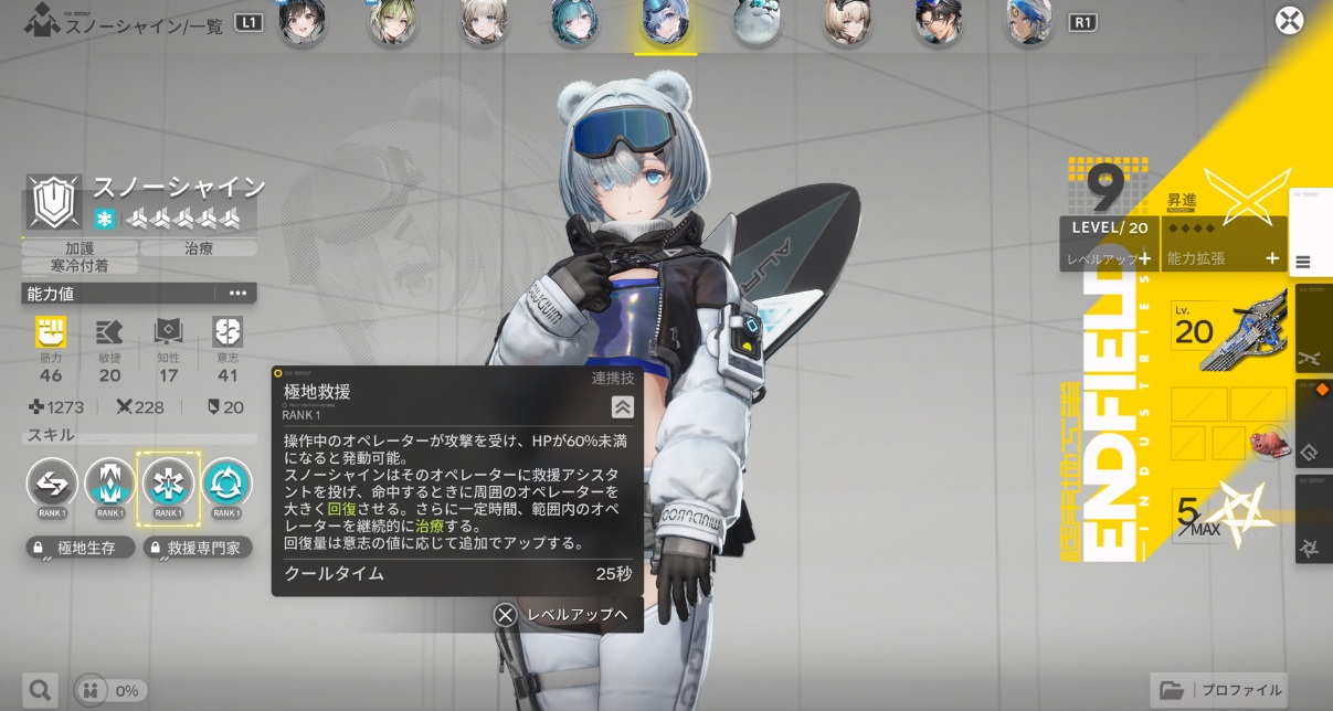 スノーシャインはそのオペレーターに救援アシスタントを投げ、命中するときに周囲のオペレーターを大きく回復させる。さらに一定時間、範囲内のオペレーターを継続的に治療する。