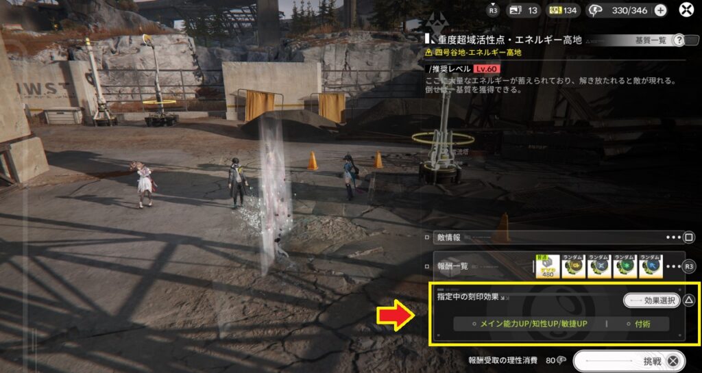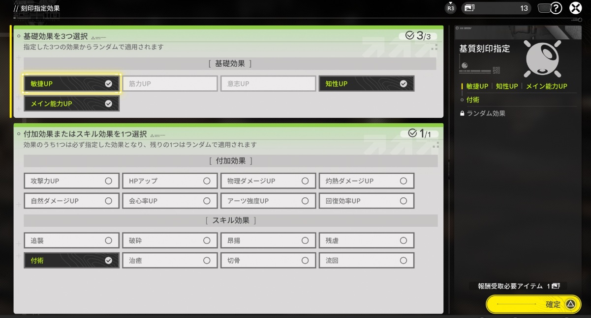 刻印券を持っている場合は挑戦画面の右下で刻印効果の指定画面へ行く事ができます。
