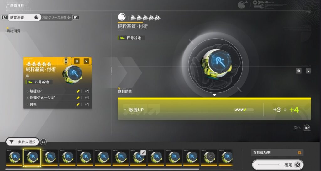 基質食刻は要らない金基質を使って基質を強化する場所です。+3くらいまではそこそこ簡単にあがってくれるんだけどそれ以降は失敗の連続となるので沼コンテンツです。