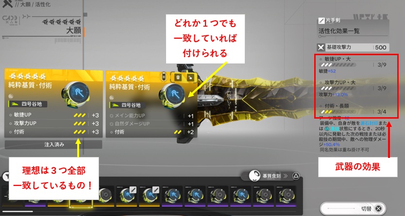 基質の装着画面を開いた時に先ほどの武器の効果も表示されますから、一致するものを選んで武器に付けてみましょう。効果のうちどれか1つで一致すれば付ける事はできますが残りの2か所が無駄になるので理想となるのは3つの効果が全て一致しているものです。
