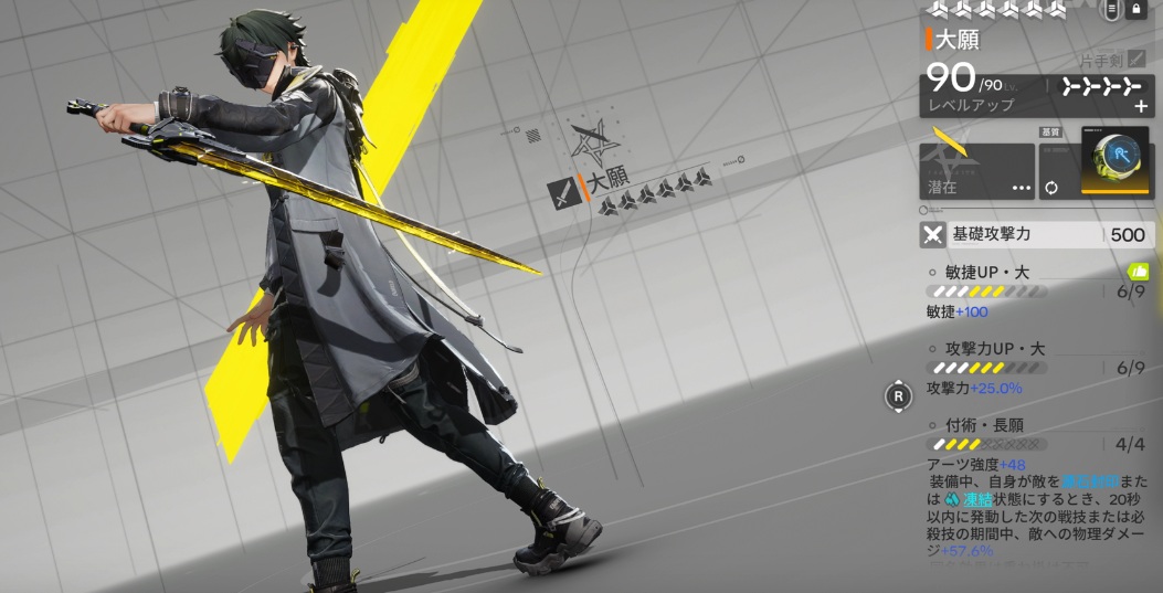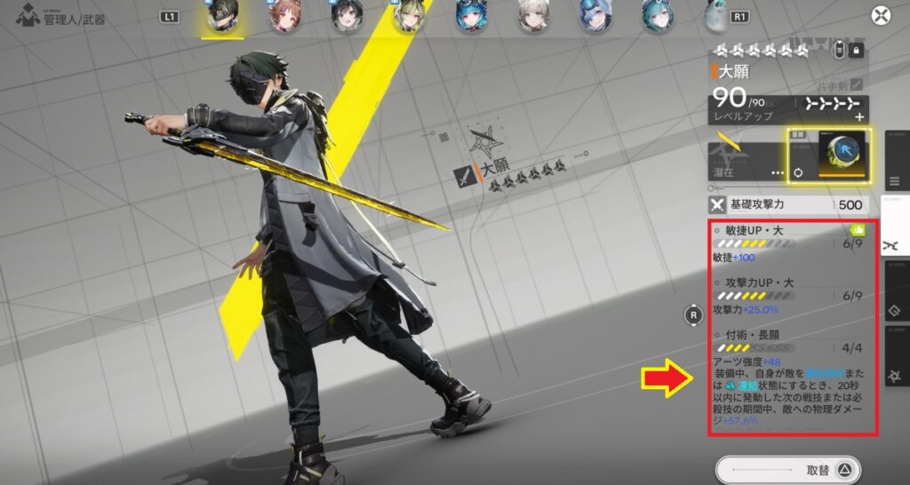 武器が持つ効果は装備画面の右側に表示されています。大願(片手剣)を例にして解説すると