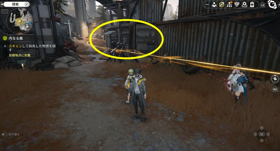 目的地の橋頭野営地に着きスキャンを行うと黄色の線は表示されますが、特にマーカーやアイコンなどは表示されません。黄色の線を頼りに↑の画像のコンテナ(建物)の中に入ってください。
