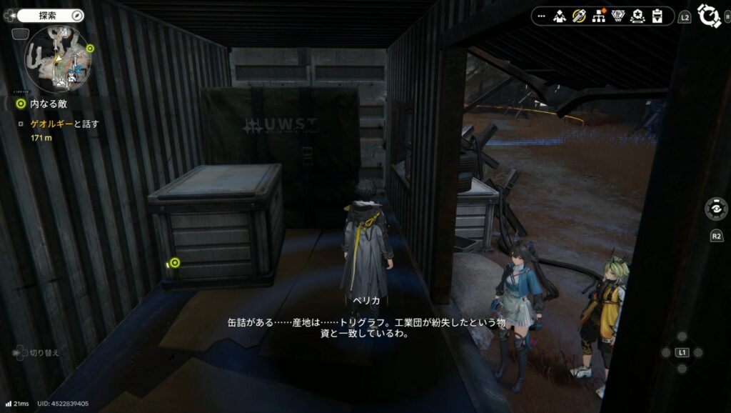 コンテナの中に入ったらもう一度スキャンします。すると急にペリカが喋りだして任務が進行します。