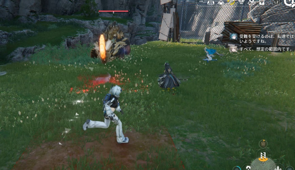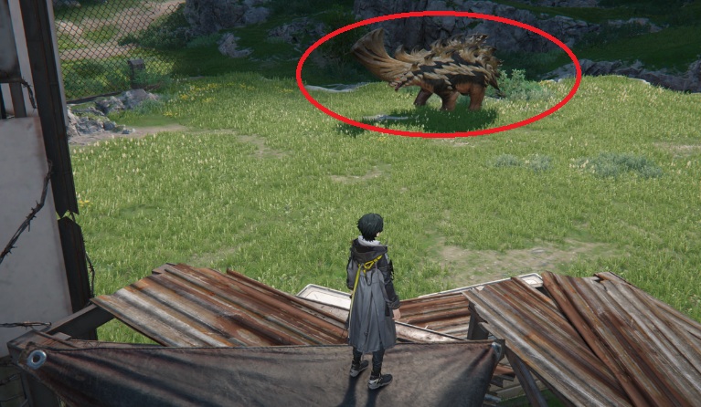 斧甲獣は大きな角を持ったモンスターで中枢エリアにある集成工業エリアの西あたりのフェンスに囲われたところにいます。他の場所にもいたと思うけどここが一番近いかも!?