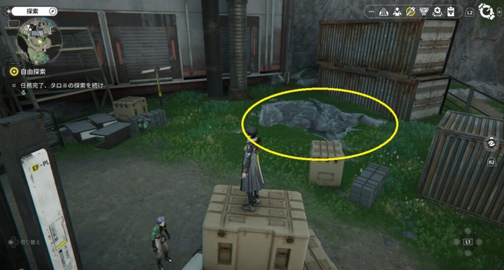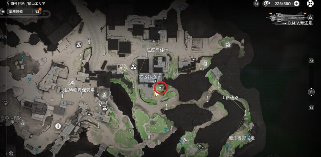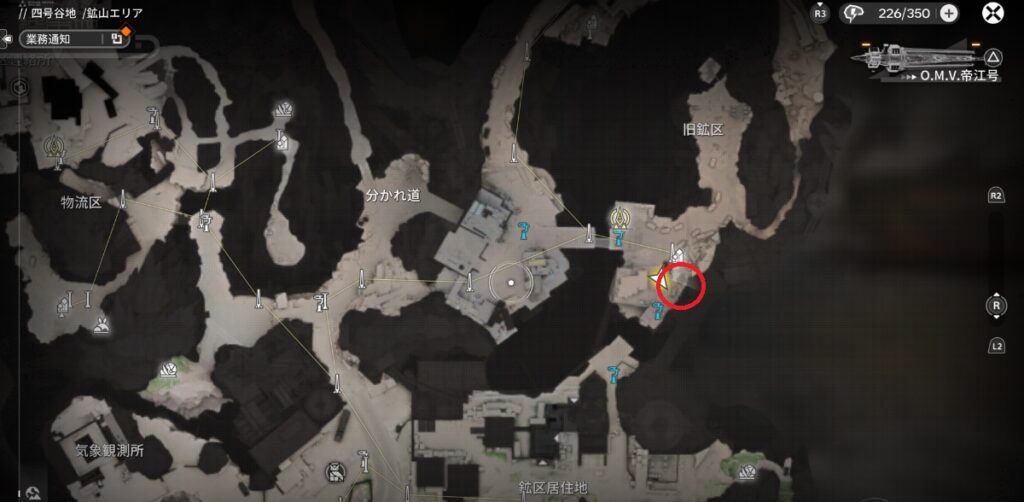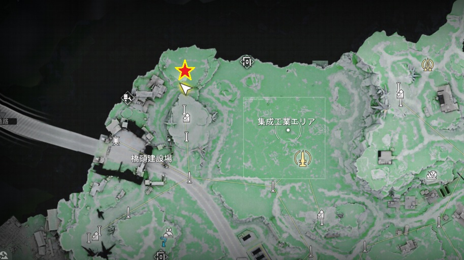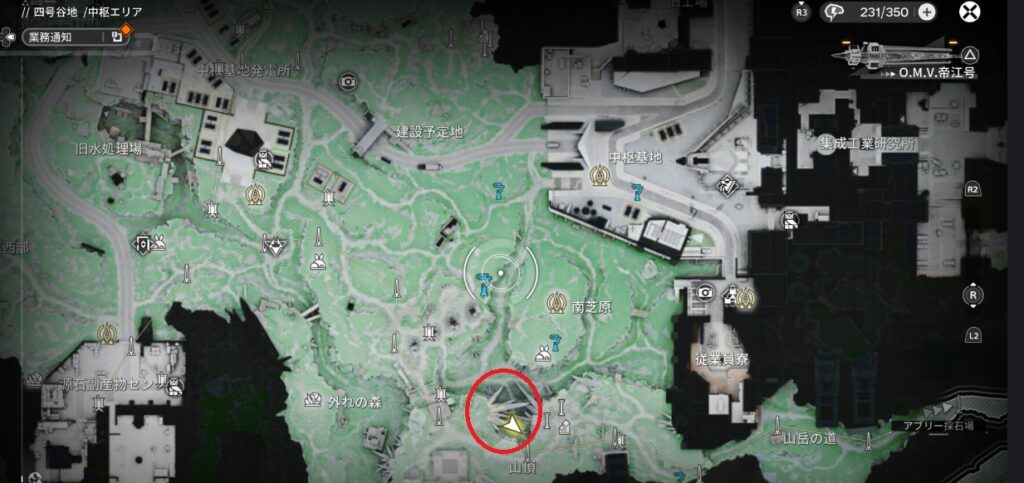 場所は中枢エリアの南の方で「山頂」って書いてある場所の近くです。