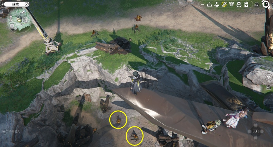 該当の場所へいくと壁面から茶色の岩がいくつか突き出しているところがあるので、突き出した岩の先端まで行きます。その後は下に見える敵を目がけて落下攻撃をすればOKです。