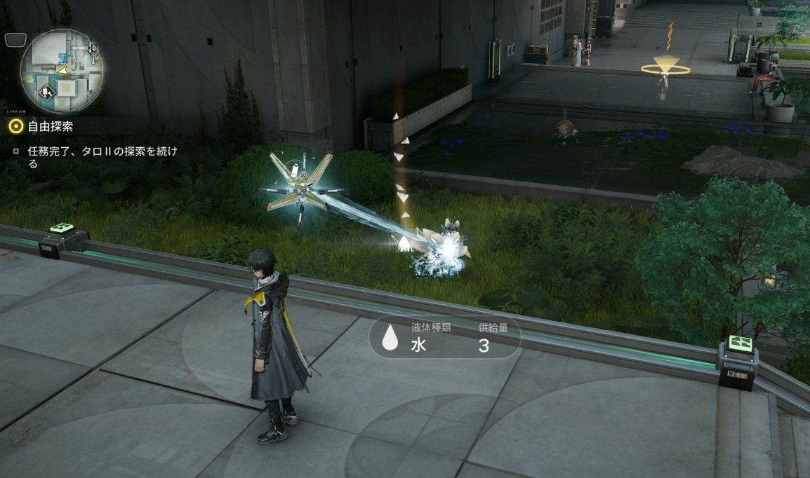 そんな動かなくなっている貯水オリジムシにドローンを使って一定量の水を与え続けると、お礼として少しばかりの報酬をドロップしてくれます。量は多くないですが育成素材はいくらあっても困りませんからね。