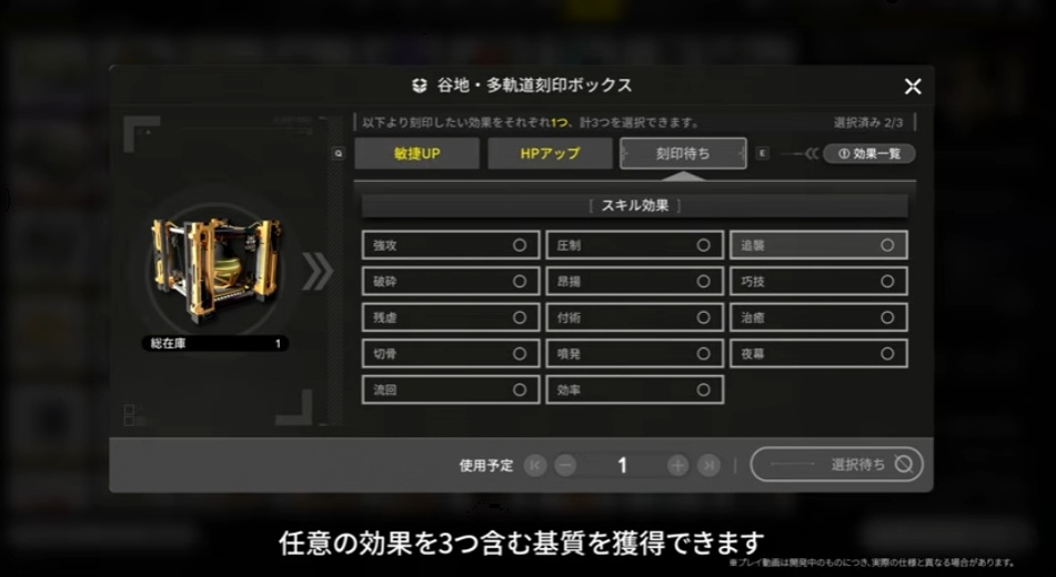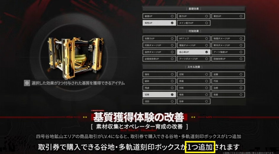 多軌道刻印ボックスというアイテムが追加になり、これにより任意の効果を3つ含む基質を獲得できるようになる。要は好きな効果が3つ選べるってこと。