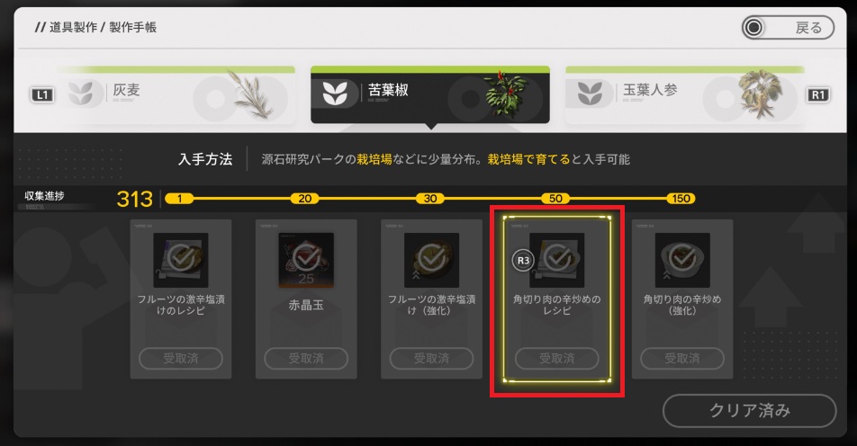 というのも「角切り肉の辛炒め」のレシピは苦葉椒を50個集めた時に、製作手帳で入手するレシピだったからです。わたしは栽培場で苦葉椒を育ててましたからレシピを解放してますけど、畑をやってないと解放してない人も多そうです。