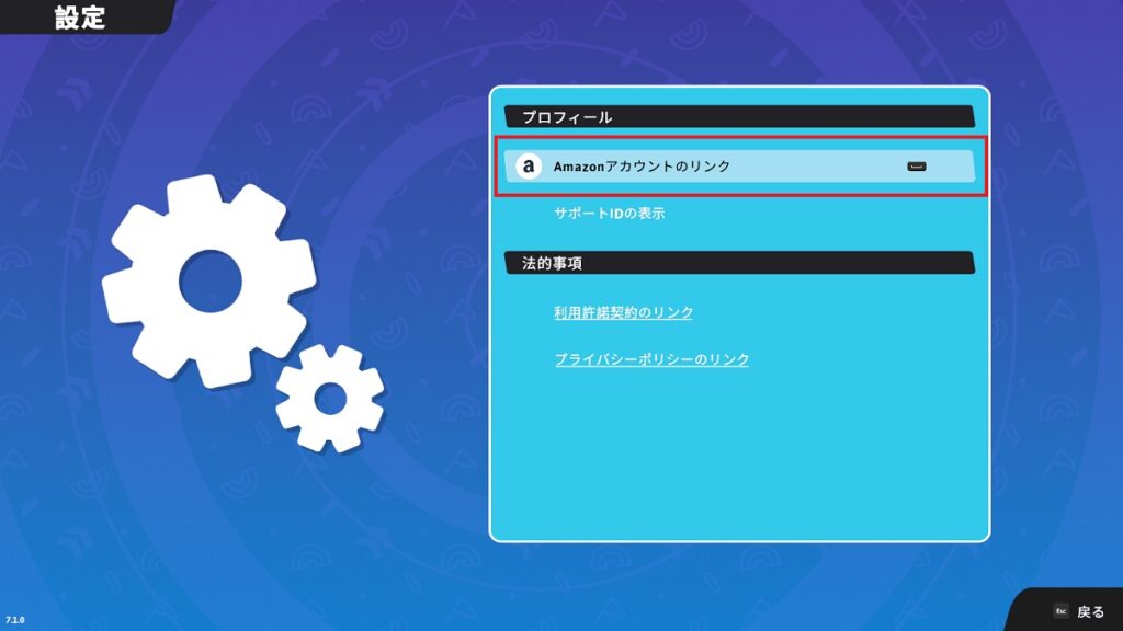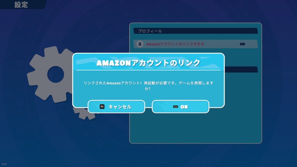 ゲーム内に戻り上記画像のような画面になっていればAmazonアカウントとの連携は成功です。