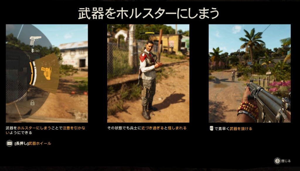 目的の村へ向かう際中に「武器をホルスターにしまう」チュートリアル。村には兵士が常駐しているので、到着前に武器をしまっておく。