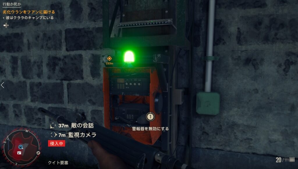 監視カメラに見つかって警報が作動してしてしまった場合は、武器庫の手前にある装置で警報器を無効にしておきましょう。同時に監視カメラも破壊しておけば、その後は増援が来ることがなくなります。