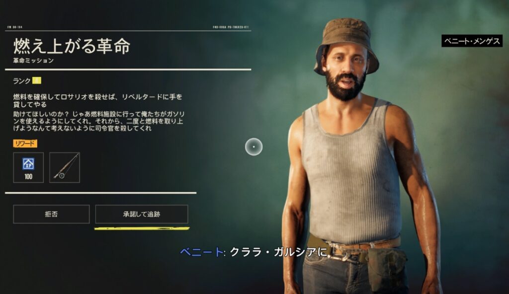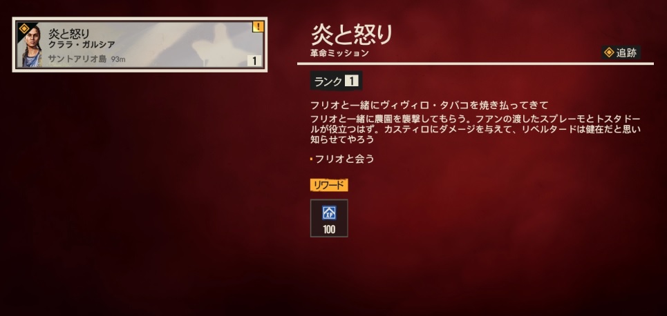 ベニートに話しかけると革命ミッション「燃え上がる革命」が開始されます。ここでのミッション内容は2つあり