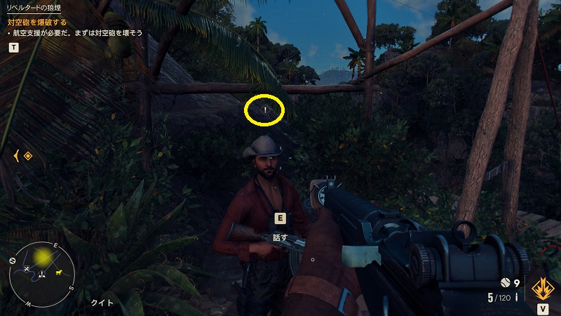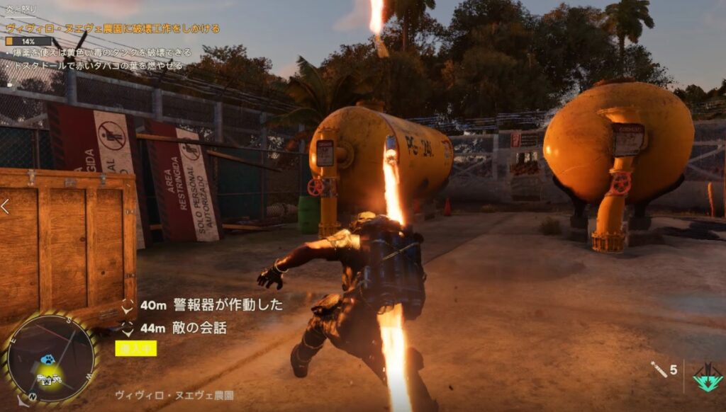 梯子を登って監視塔につくとフリオが自分語りを始めるので、会話の最中に携帯をつかって農園の状況を偵察しておく。会話が終わるとフリオが農園に突っ込んでいきます。