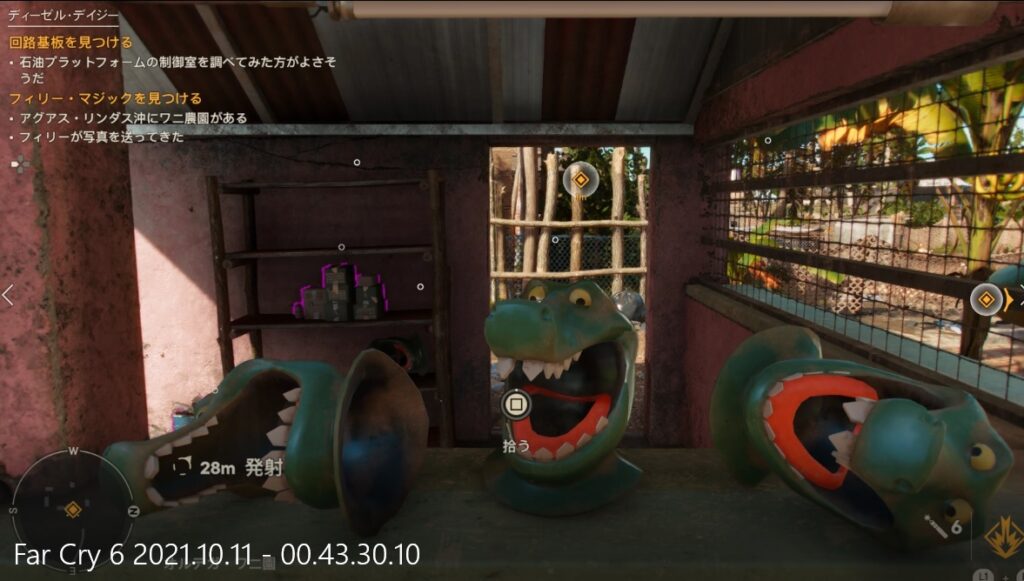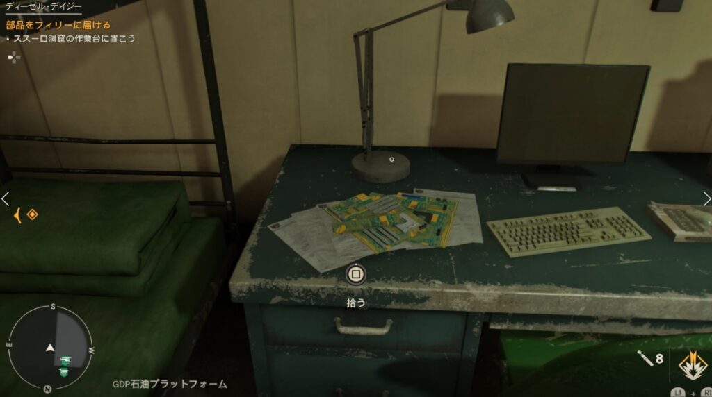 ミッション目標の回路基板はいろいろなところに落ちていたので、どれを拾ってもOK。6~7個落ちてた気がします。