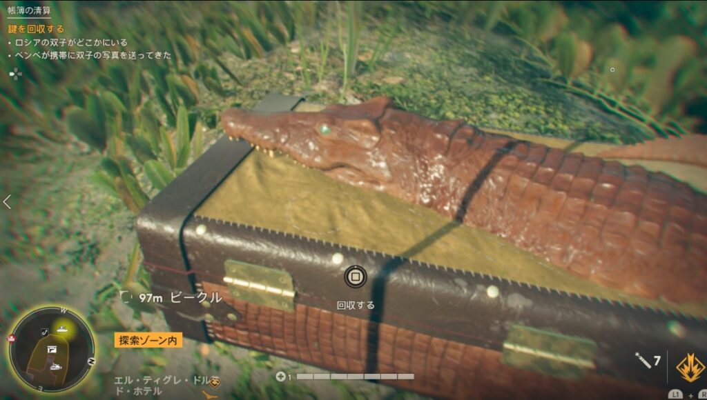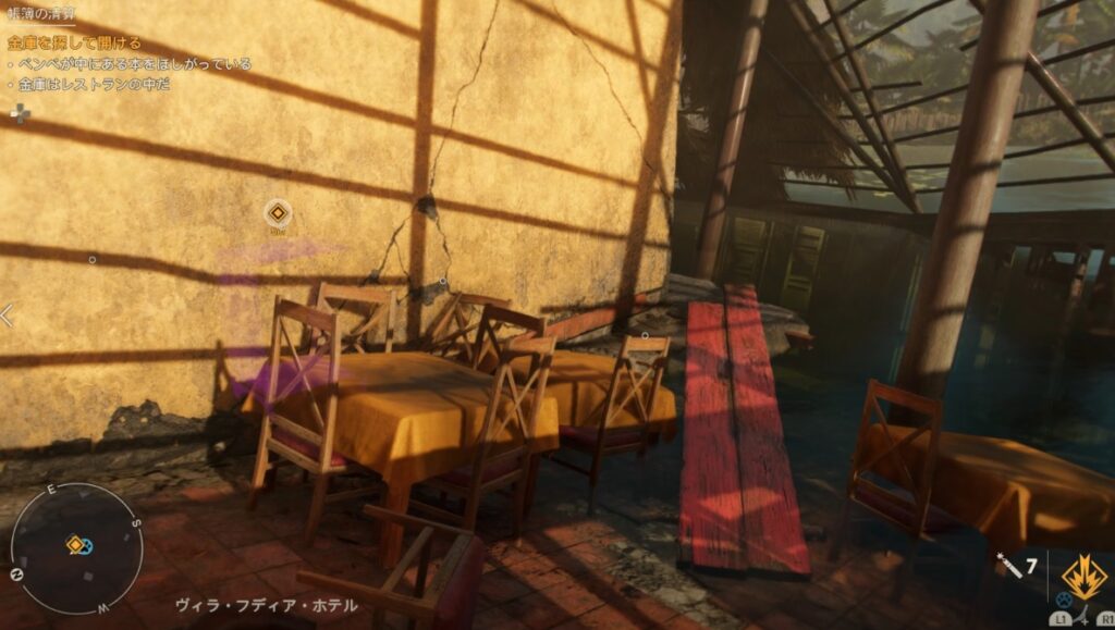 水没している建物に行き赤い板の先を進んだところに金庫があります。ここを開けるのに先ほどの「レストランの鍵」が必要。