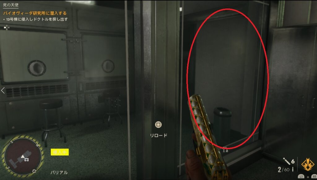 パオロはいませんがインパクトドライバー(固有ライトマシンガン)があります。扉はどうやっても開かないので、近くの屋根にジャンプで登って取りましょう。