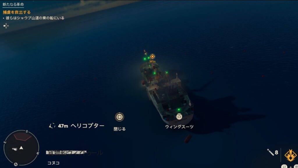 船に降りたらミニマップの水色の点を目印に捕虜を解放します。個人的にはステルスのアサシンプレイが捗った楽しいエリアでした。