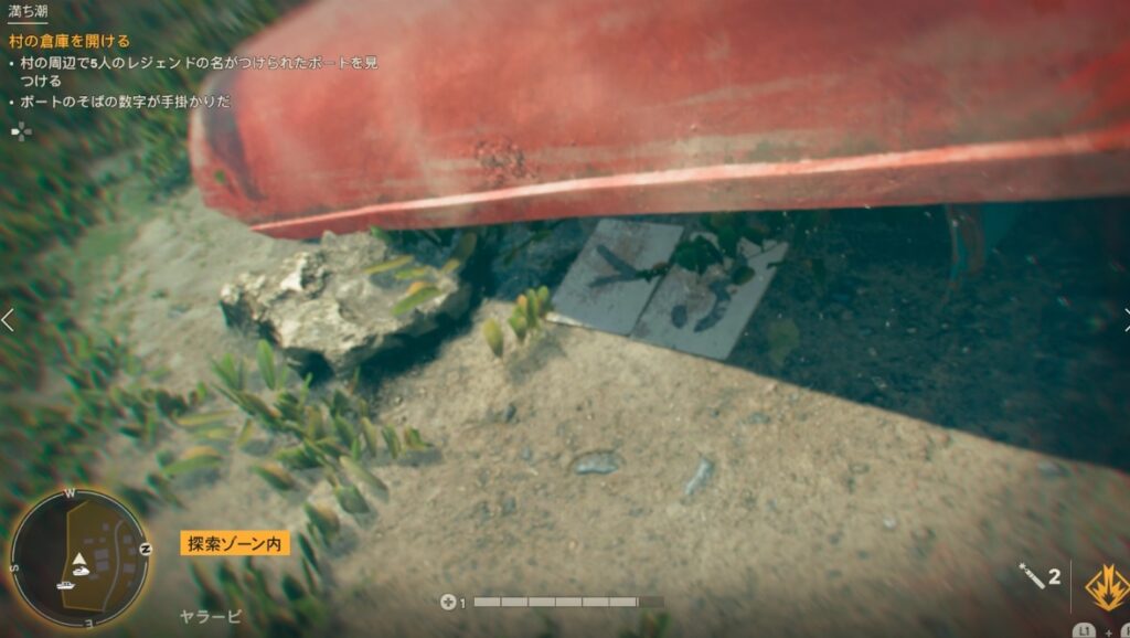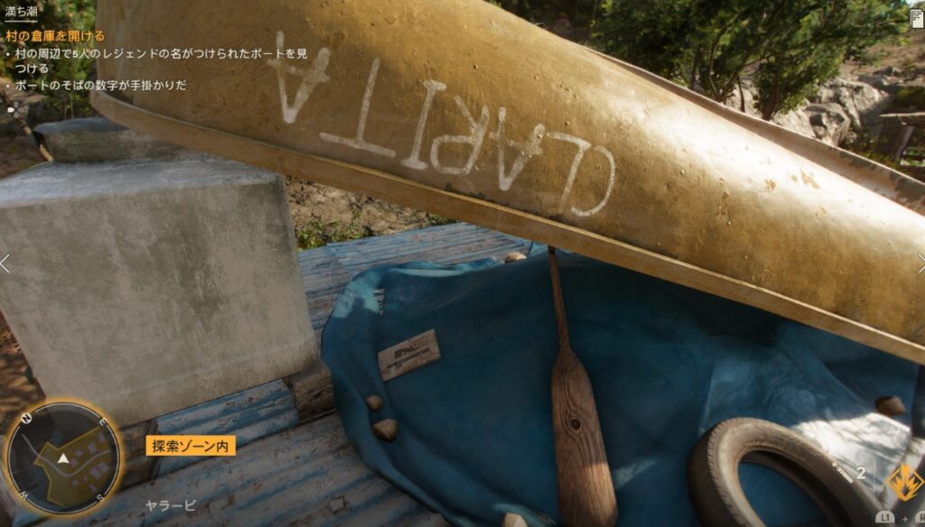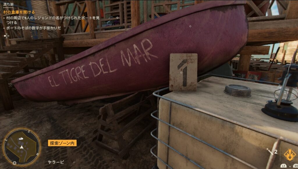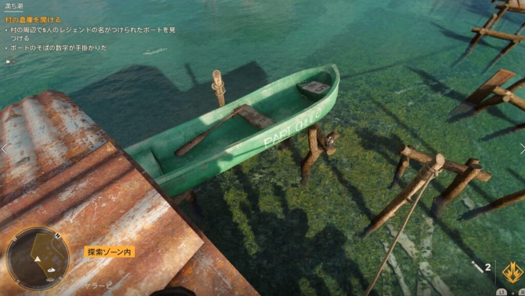村の中にある船を探しそこに書かれた名前と数字をチェックすると、スイッチの順番が分かるようになっています。