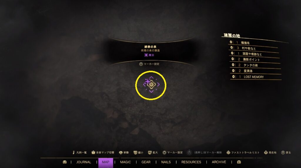 「?」にカーソルを合わせタッチパッドを押すとマップに該当の場所の祝福の泉が表示されます。後は、ここを目指して移動していくだけですが、メインの進行具合によっては行けない場所もあるのでどうしても行けない場合はメインを進めましょう。