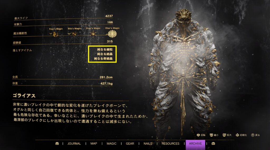 これによると純なる奇結晶はモンスターからのドロップのようです。対象となるは「ゴライアス」「アンフィシノドン」「アプサラビス」。