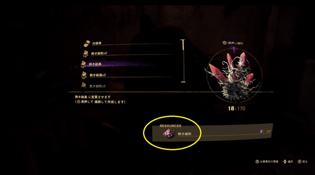 純なる細粒や純なる結晶はフィールドで多数見つかるモンスターからドロップします。ワニや山羊、鹿など種類は多いので宝箱などを回収しながら倒しておくと勝手に集まってくると思う。