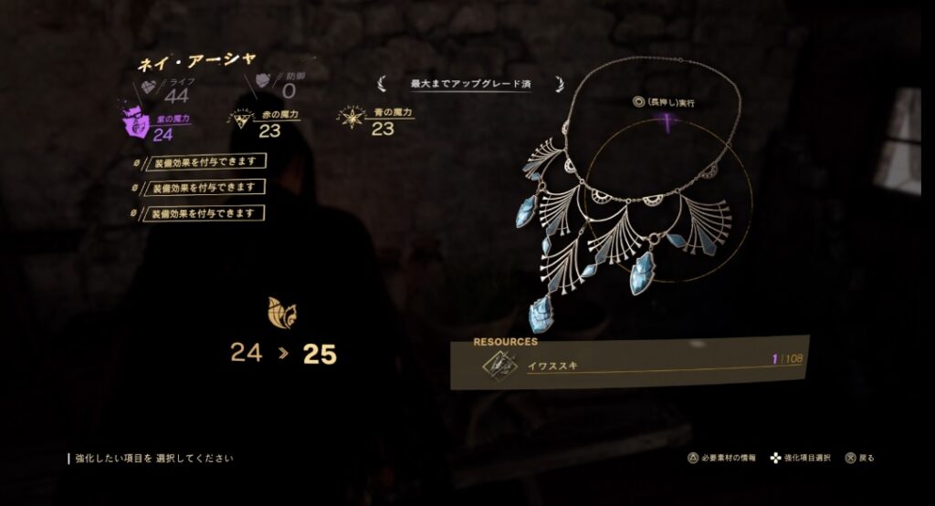 ネックレスの強化最大値もマントと一緒ですね。こちらも初期に拾ったネックレスでも同様に最大まで強化出来ました。
