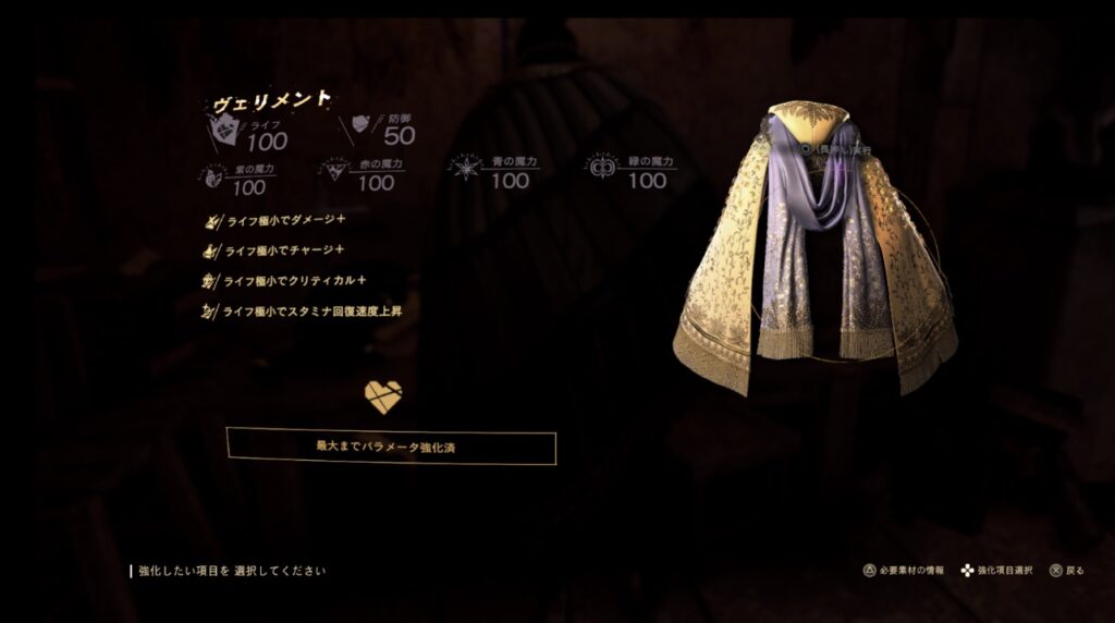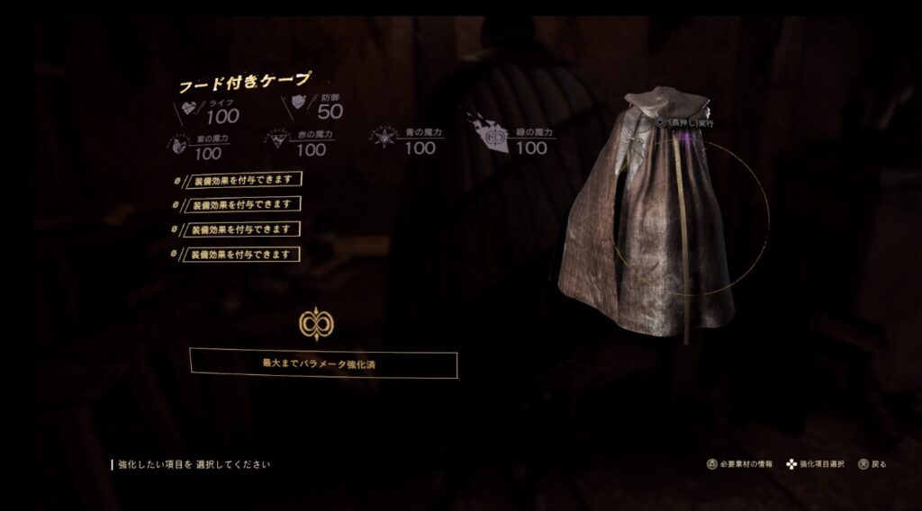 ちなみに、一番最初に手に入るフード付きケープも最大値まで強化できました。4つほどマントを強化してみたんですが全て最大値まで強化できましたね。