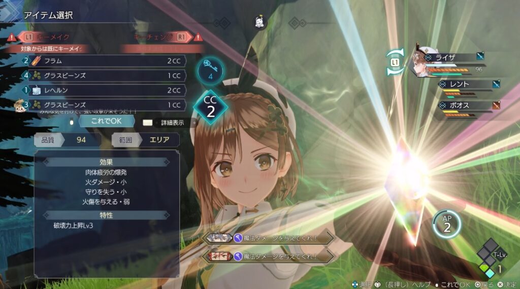 こういったコマンド系のRPGだとレベルを上げて殴るってのが大正義だったりするんだけど、ライザのアトリエの場合は調合でいいアイテムを作って殴るって感じですからね。素材を集めたり調合したりと時間は取られるし、この過程が楽しめないと多分辛くなると思う。