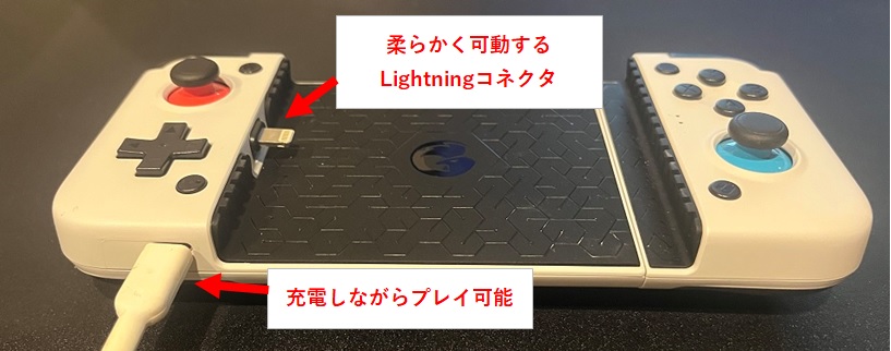 Lightningコネクタで直接スマホと繋ぐ有線接続。スマホ用のコントローラーでよくあるのがBluetooth接続だけど、それに対して有線で繋ぐのでラグが発生しないのが嬉しい。