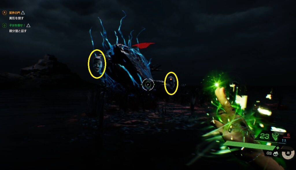 - 顔の両側とお尻にコア(お面)があるのでそこを狙って攻撃