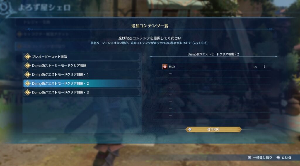 体験版のストーリーモードとクエストモード3種をクリアするとDemo版クリア報酬が獲得できます。こちらは製品版のゲーム開始時には取得しておらず、ストーリーを少し進めることでよろず屋シェロから受け取ることができます。