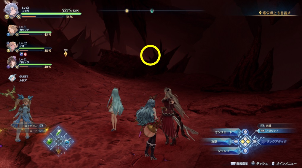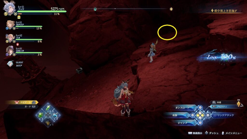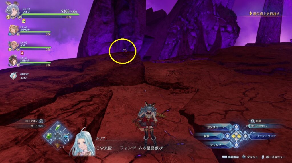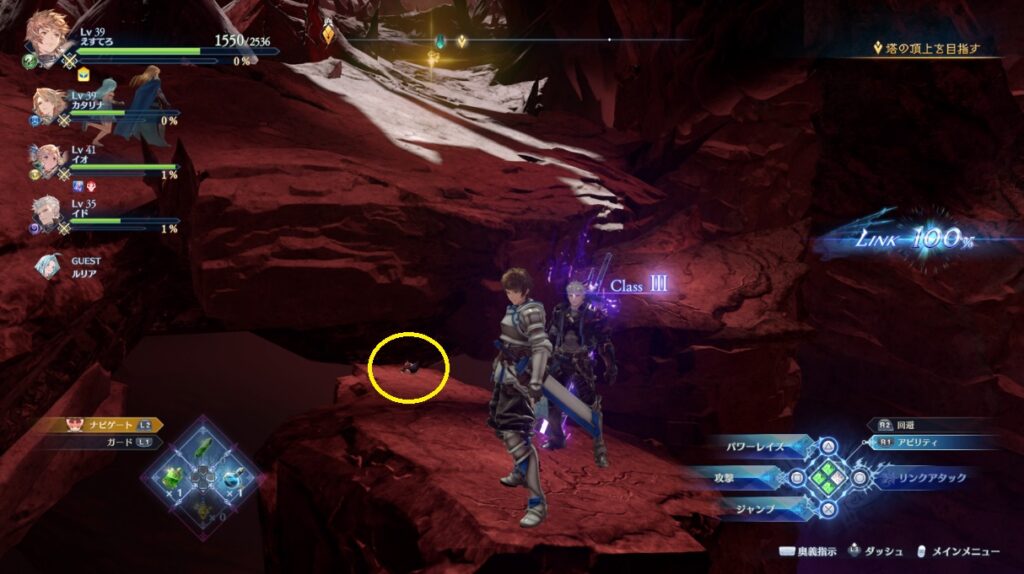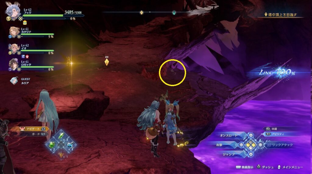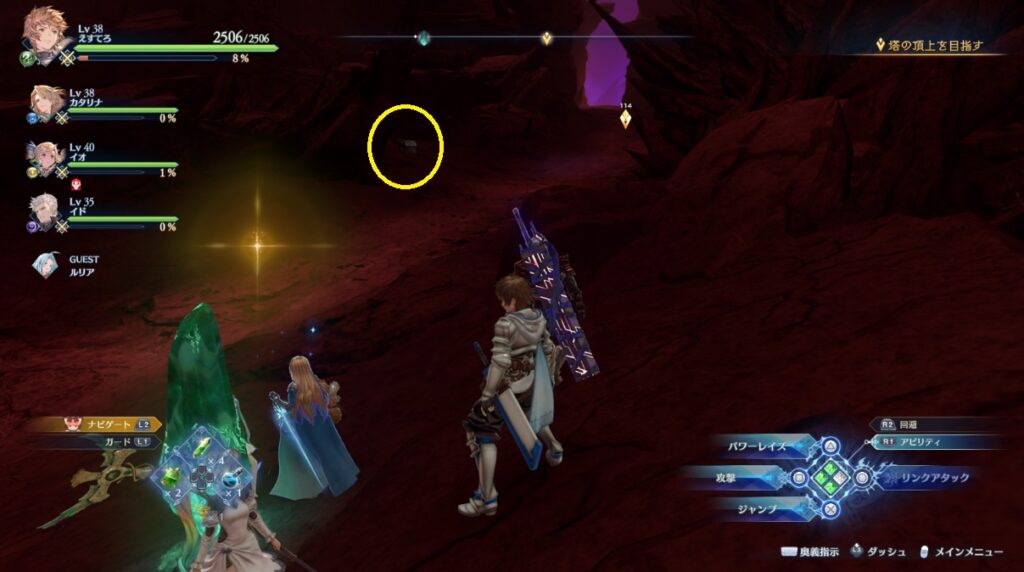 ヴォルカンボーラ・ニヒラと戦った場所から脱出する坂を登っている途中の右側。浮いている岩の上。