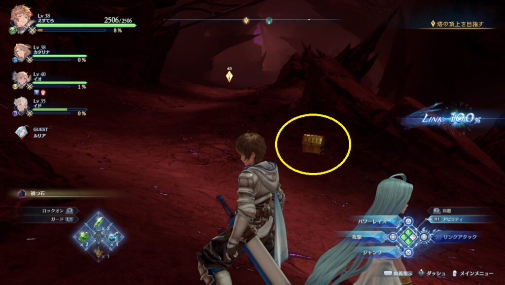 スタートしてすぐに左側の崖を飛び越えて渡る。渡った先に宝箱。