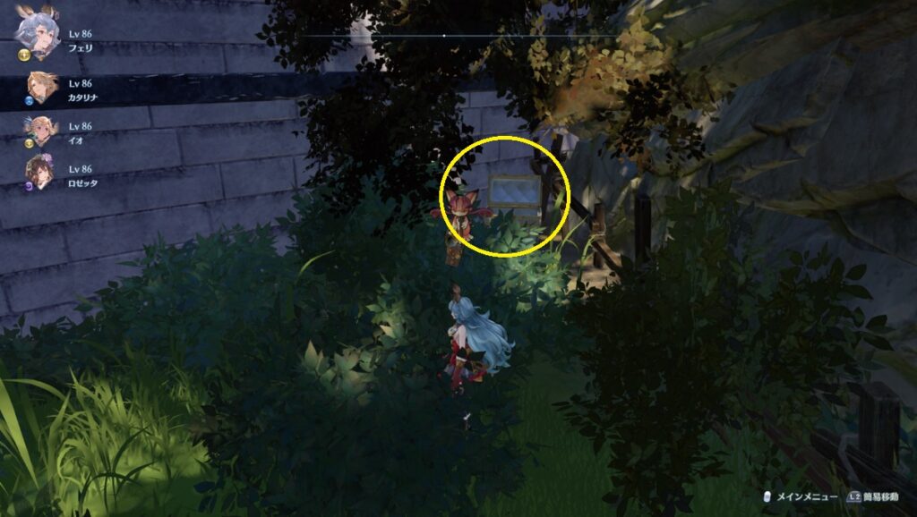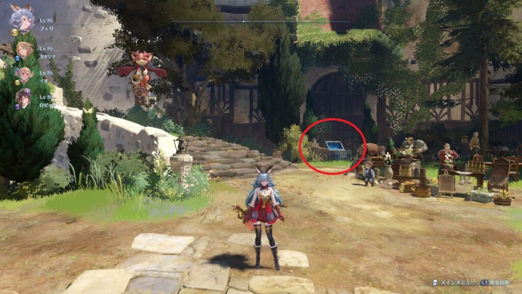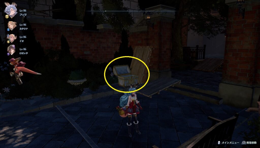【白翼の鍵】教会に向かって右側の階段を登り突き当りを左へ行く。奥の茂みの中に宝箱。