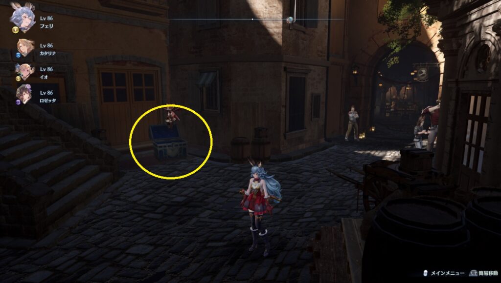 【白翼の鍵】ザスバの酒場近くの橋を画像の方向へ進む。道なりに進んでいくと宝箱。