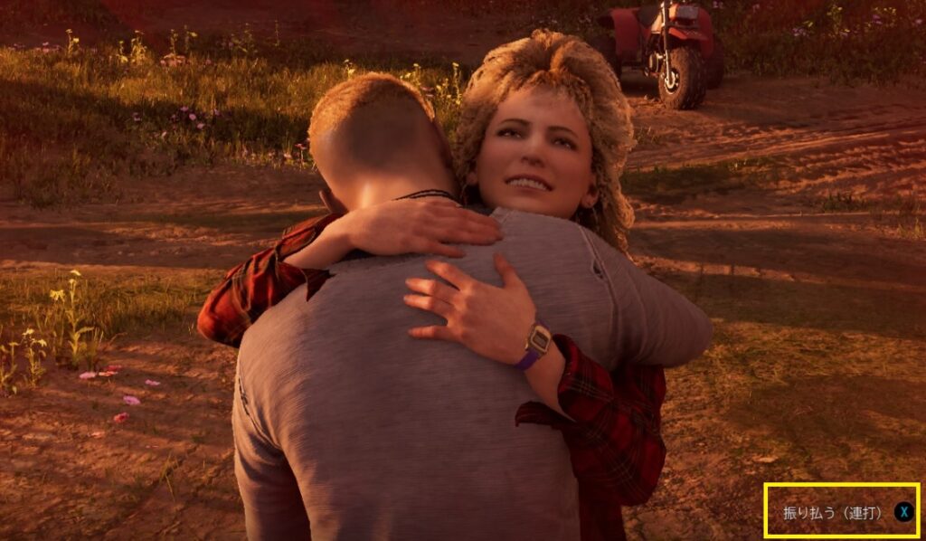 これ最初は本気で???だったんですが、「考え直す」での再開後は画面右下にチラッと操作方法が表示されます。あとは母親(幻影)を振り払い銃で撃つだけです。