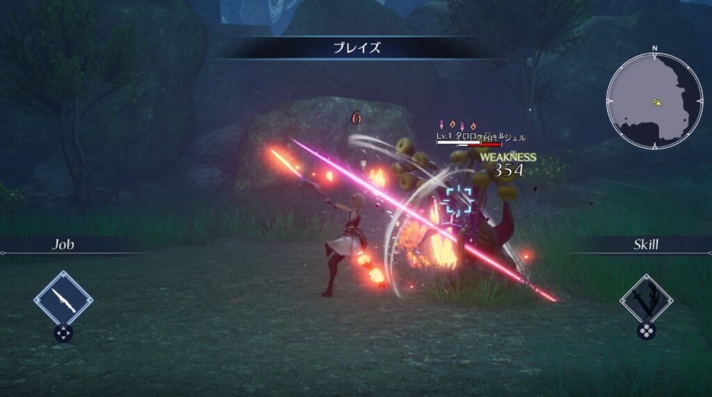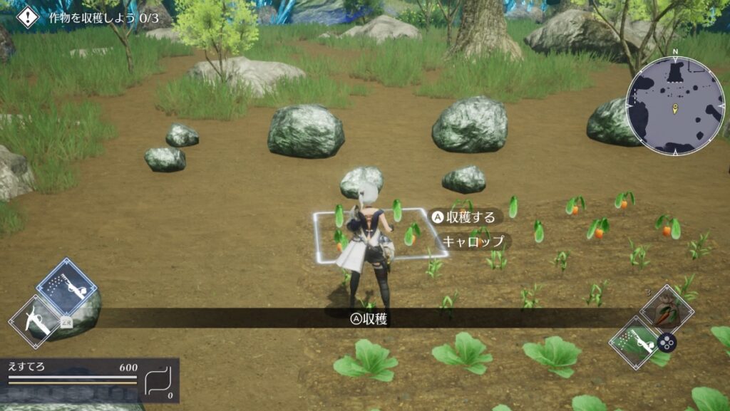 ガード・回避のようなコマンドがないので、基本は攻撃ボタンをポチポチしながら敵を倒します。ここでは採集のチュートリアルもあるので画面の指示に従い進めて行きましょう。