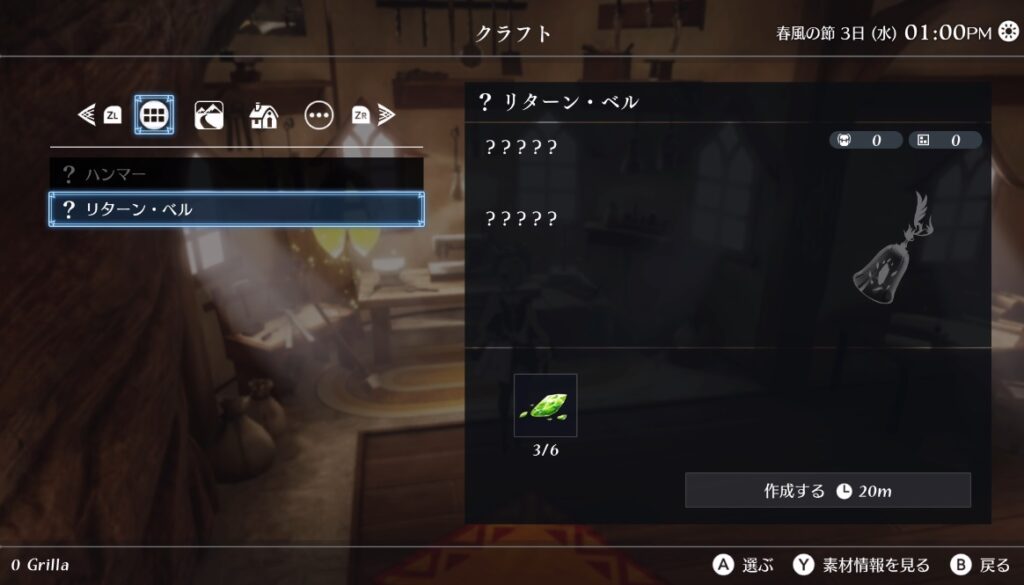 リターン・ベルのレシピと素材を貰うのでクラフト台で作成する。クラフトはスタミナではなくゲーム内の時間を消費する。