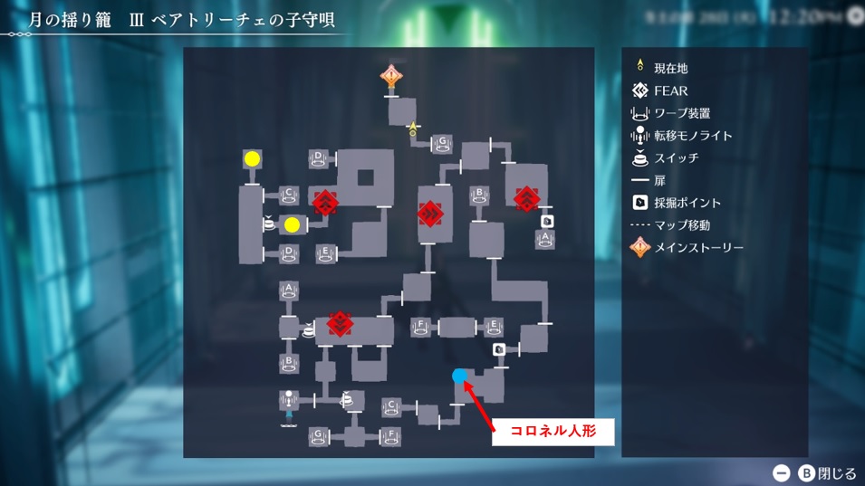 ここからは基本的にアルファベット順にワープをくぐっていけば奥へ進めるはずです。ここのFEARは警報が鳴らないと動きだしません(攻撃をしてもGUARDの表示がでて無反応です)。なので、扉の前にいるFEARを動かしたい場合は無理やり警報に振れる必要があります。