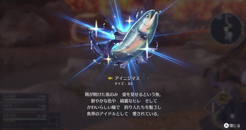まずはこの3種を釣ってからそれ以外のヌシに挑戦するのが効率的かと思います。ちなみに管理人が一番時間がかかったのがアイニジマスです。釣れなかったらタイトルに戻ってロードを繰り返し全部で8日目くらいで釣れましたw